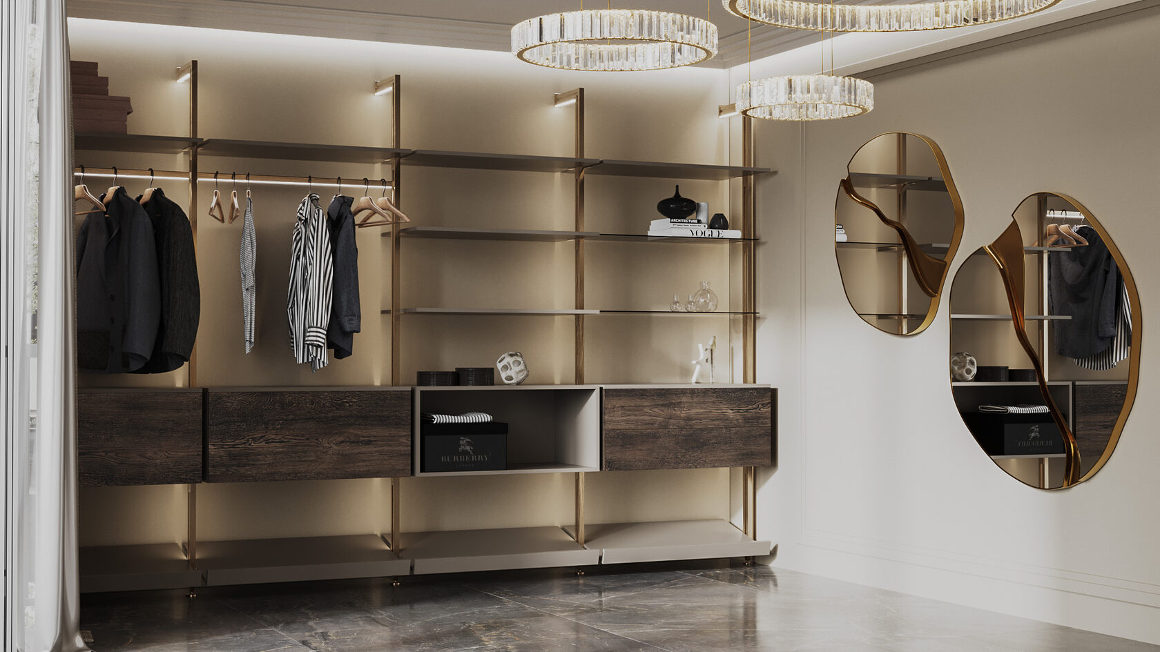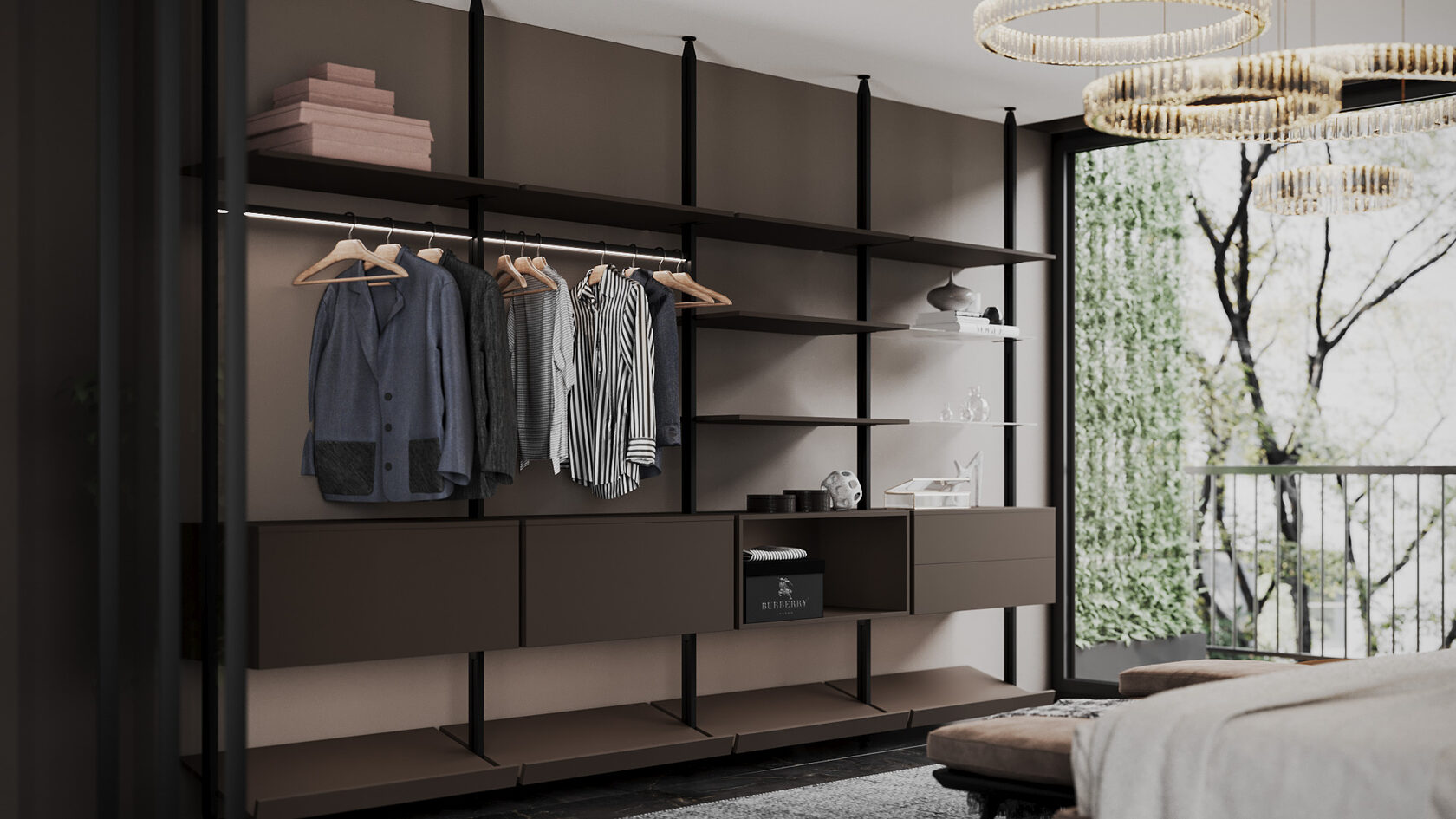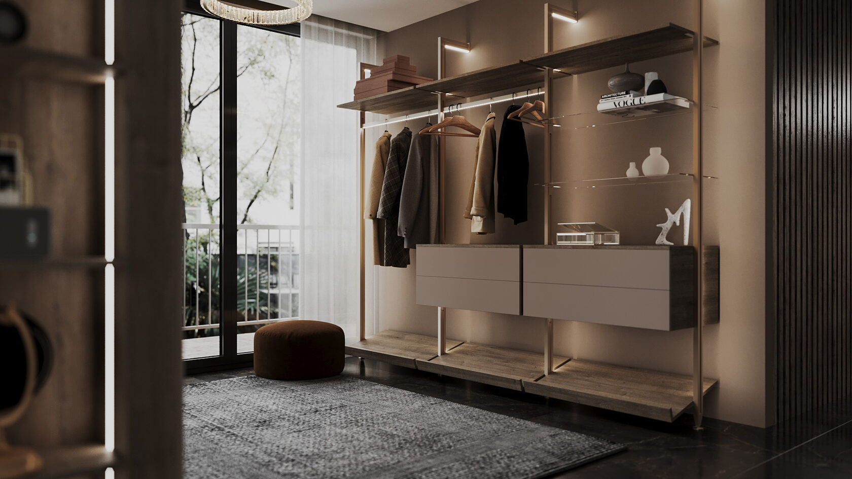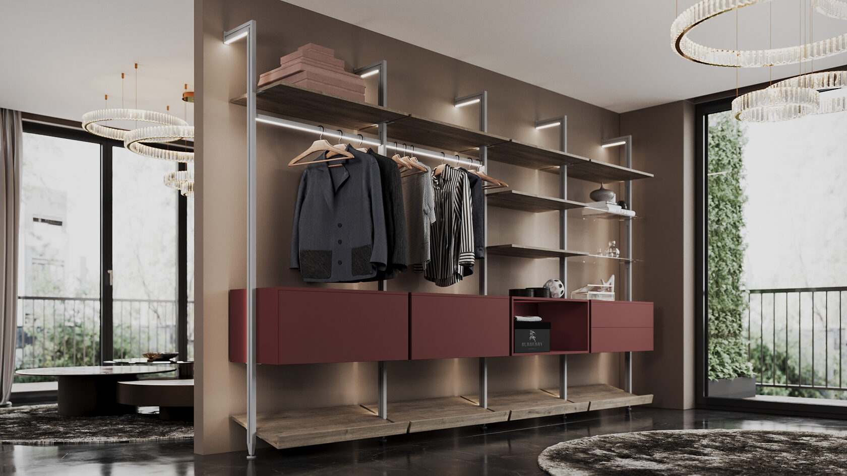 Система заменяет классический шкаф, превращая хранение в часть интерьера. Все на виду — но в строгом порядке: одежда по цветам, обувь на наклонных полках, аксессуары — в выдвижных модулях.