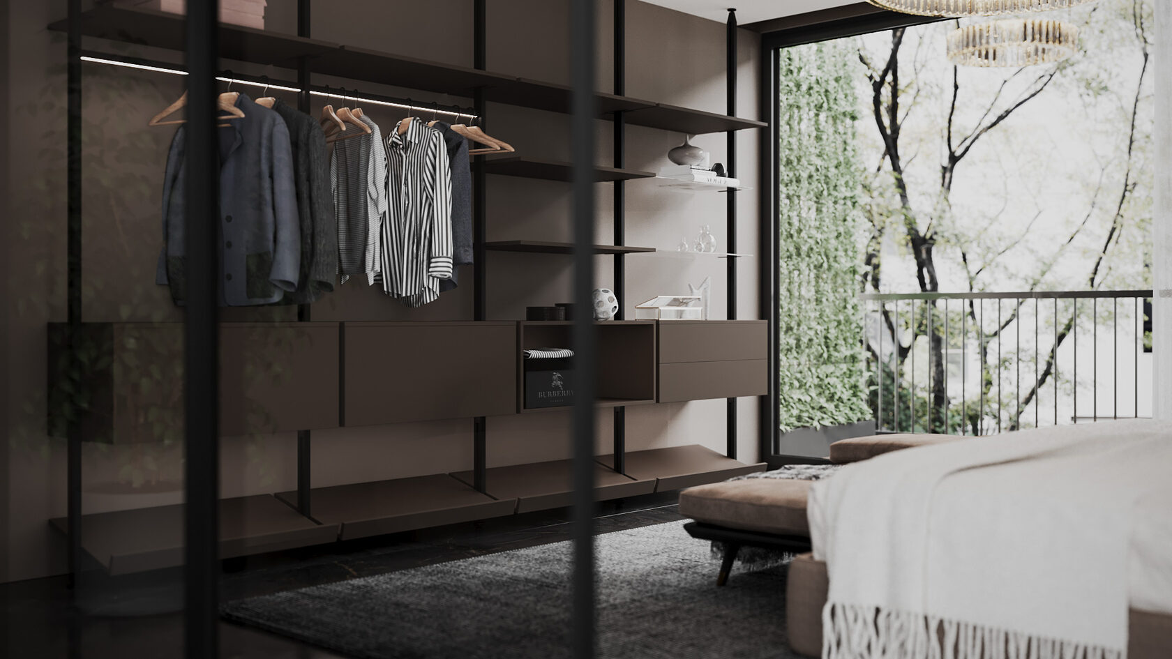 1. Открытая гардеробная в спальне