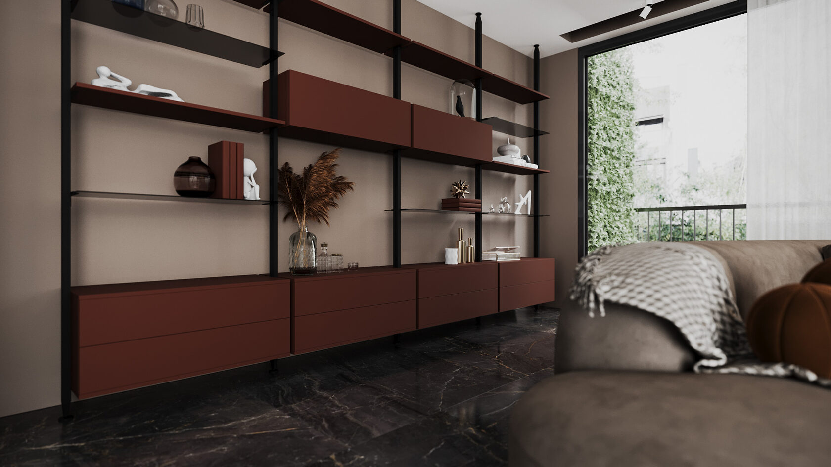 Здесь система становится выставочной платформой: для книг, виниловых пластинок, керамики или винных бутылок. Благодаря легкости конструкции, даже крупная композиция не перегружает пространство.