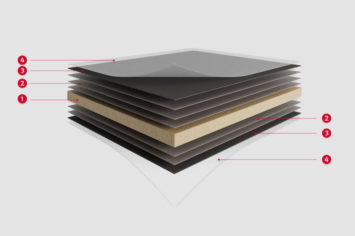 - Бумажно-слоистый пластик с двух сторон плиты гарантирует высокую прочность и долгий срок службы покрытия.